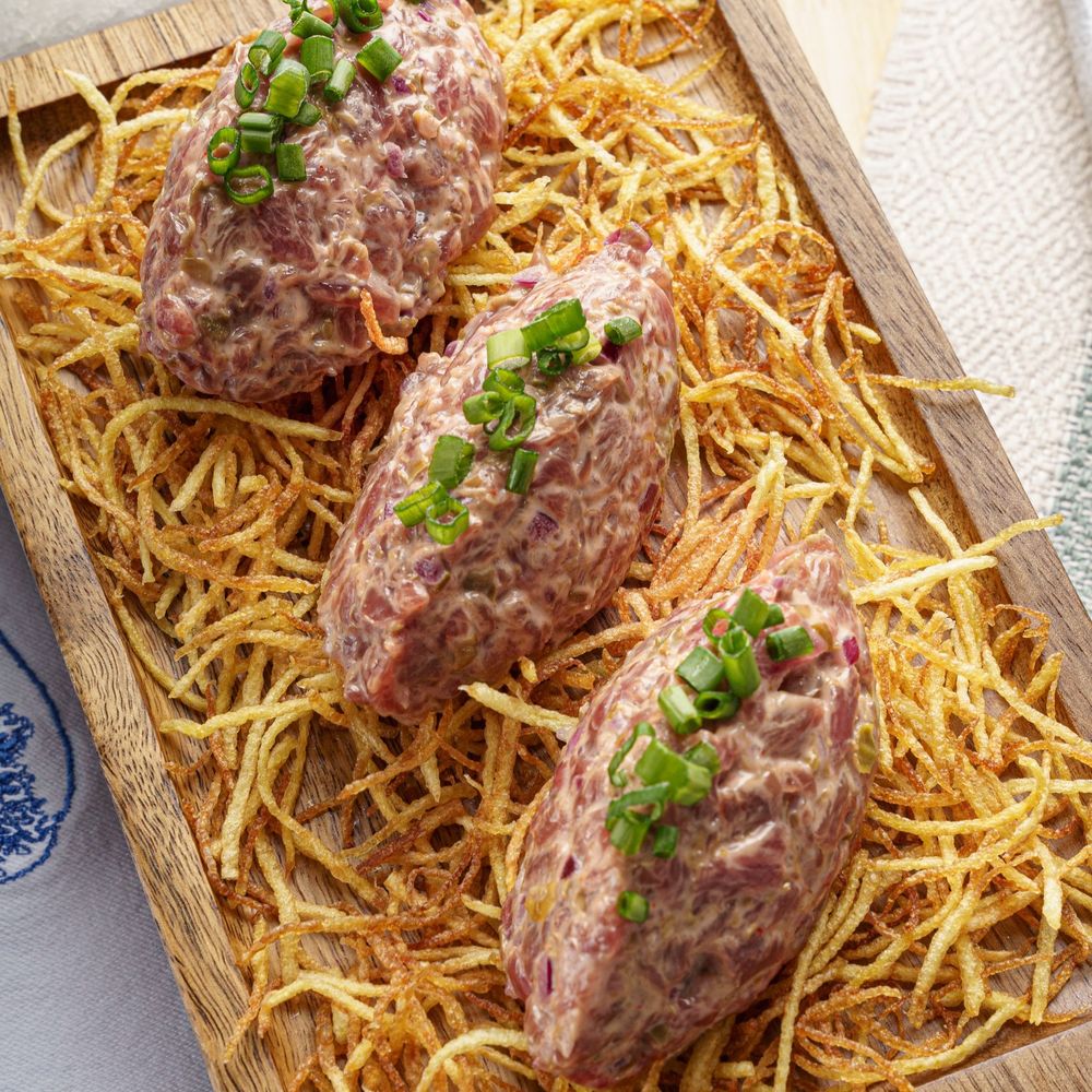охложденное мясо телятины, картофель пай, каперсы, красный лук, японский майонез, соус кимчм