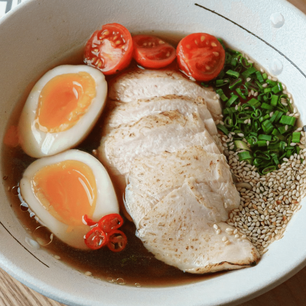 куриный бульон, пшеничная лапша, яйцо аджитами, филе куриное, зеленый лук, кунжут, черри, перец чили