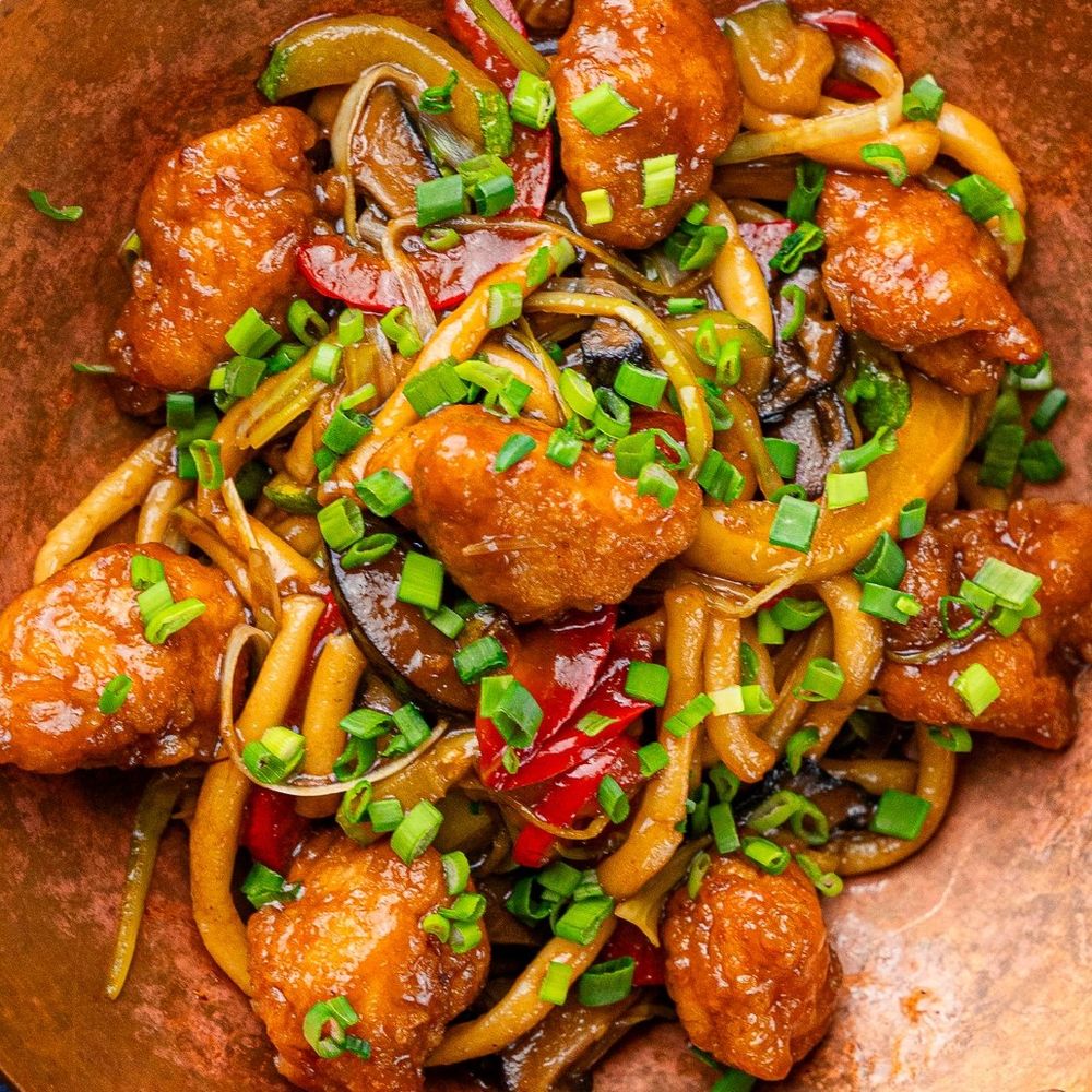 цыпленок карааге,лапша пшеничная, болгарский перец, цукини, лук порей, грибы шиитаки, ростки бобов, чеснок, соус терияки, зеленый лук