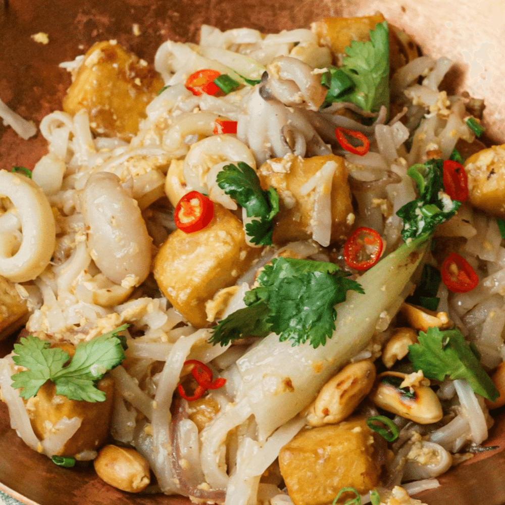 рисовая лапша, кальмары, осьминог, креветки, жареный тофу, соус пад-тай