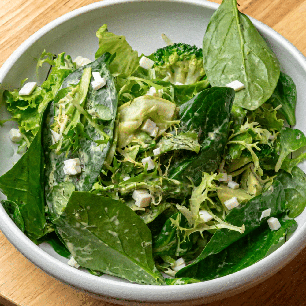 микс салат, шпинат, цукини, брокколи, авокадо, сыр фета, соус на основе греческого йогурта и зелени