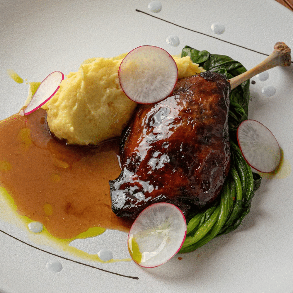 утиная ножка, карамелизированная в глазури цумэ, с картофельным кремом и шпинатом