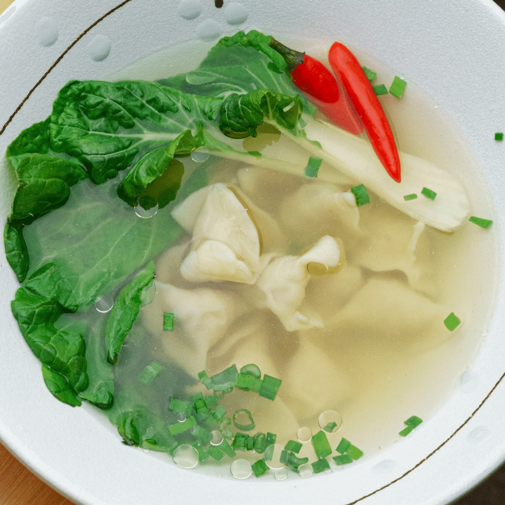 куриный бульон, вонтоны с цыпленком, лук зеленый, пак чой, перец чили