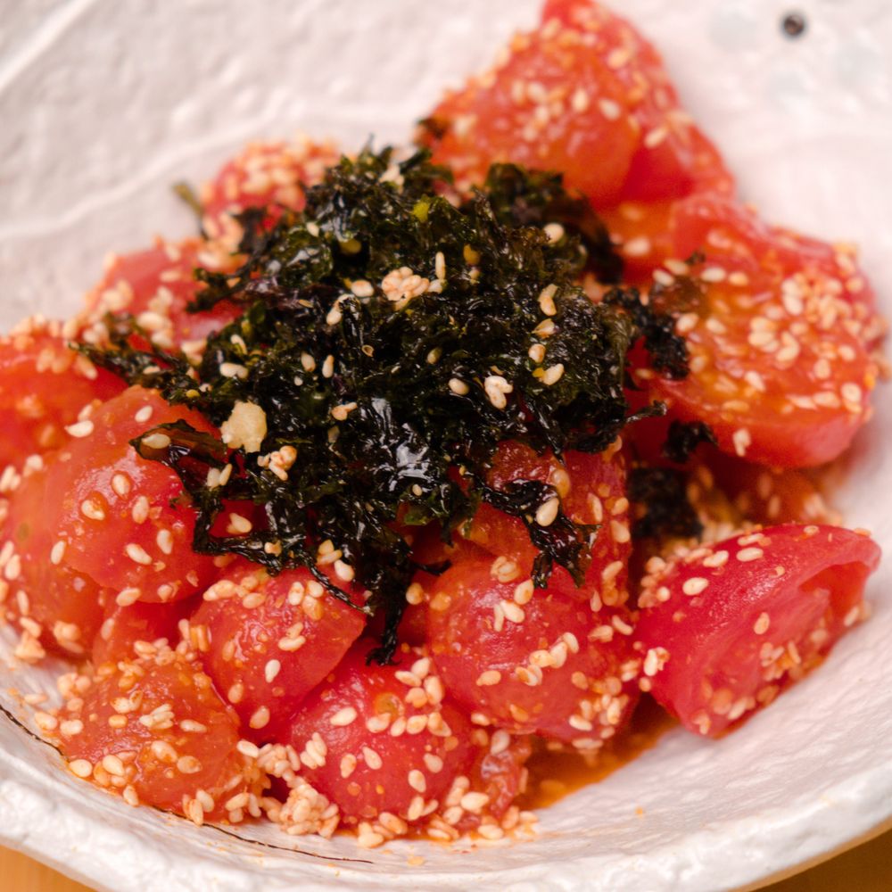 бланшированные черри, заправка на основе саке, соевого соуса, сока юдзу, кунжут, криспи нори