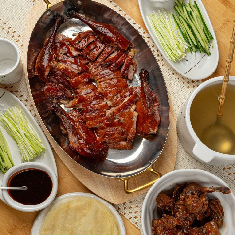 половина глазированной утки, кориандр, соломка из огурца, лука порей, лепешки, утиный бульон
