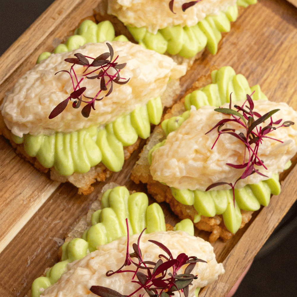 тост из жареного риса, мусс авокадо, охлажденное филе гребешка, спайси майо