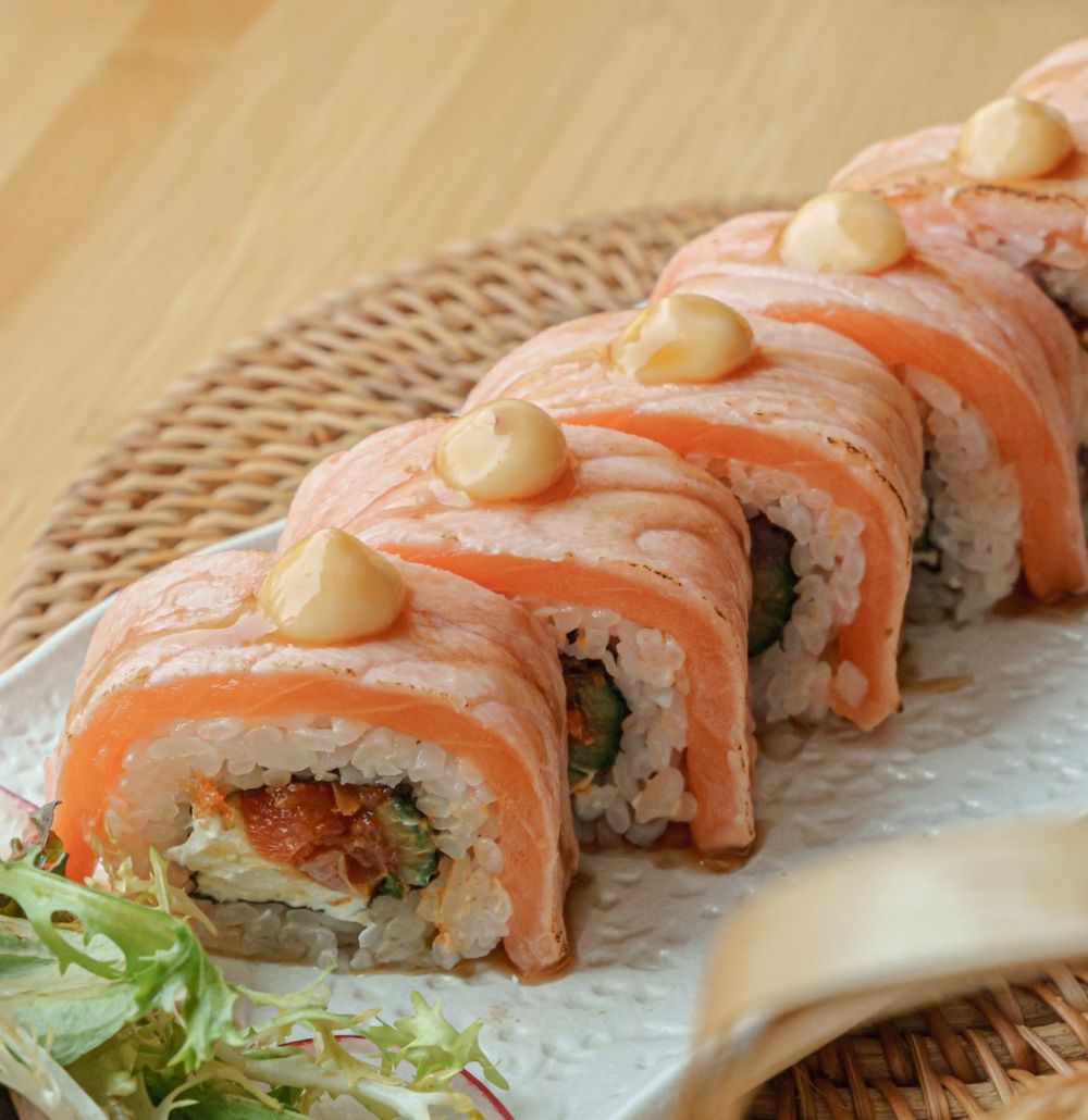 лосось опаленный, тунец, огурец, креметте, соус кимчи, базилик, соус унаги