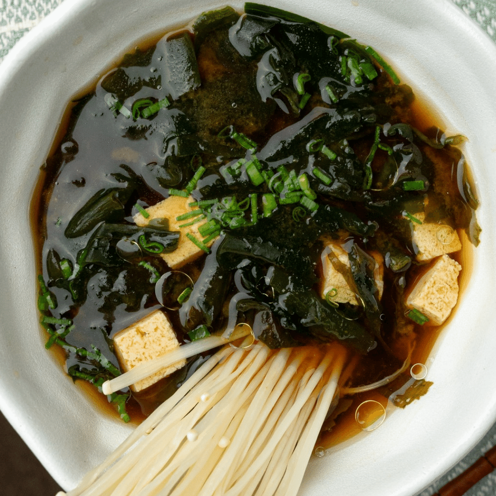бульон мисо, сыр тофу, водоросли вакамэ, грибы эноки