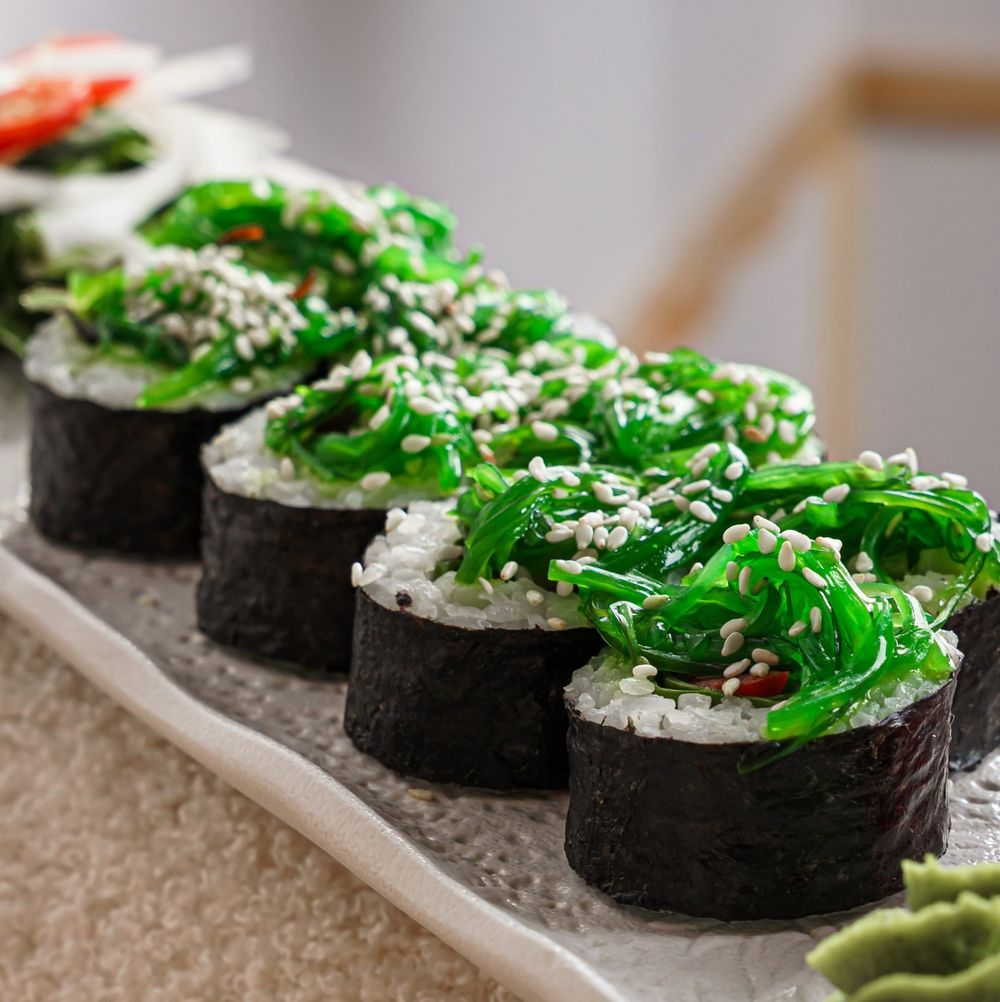 чука, огурец, авокадо, перец болгарский, шпинат, ореховый соус , кунжут