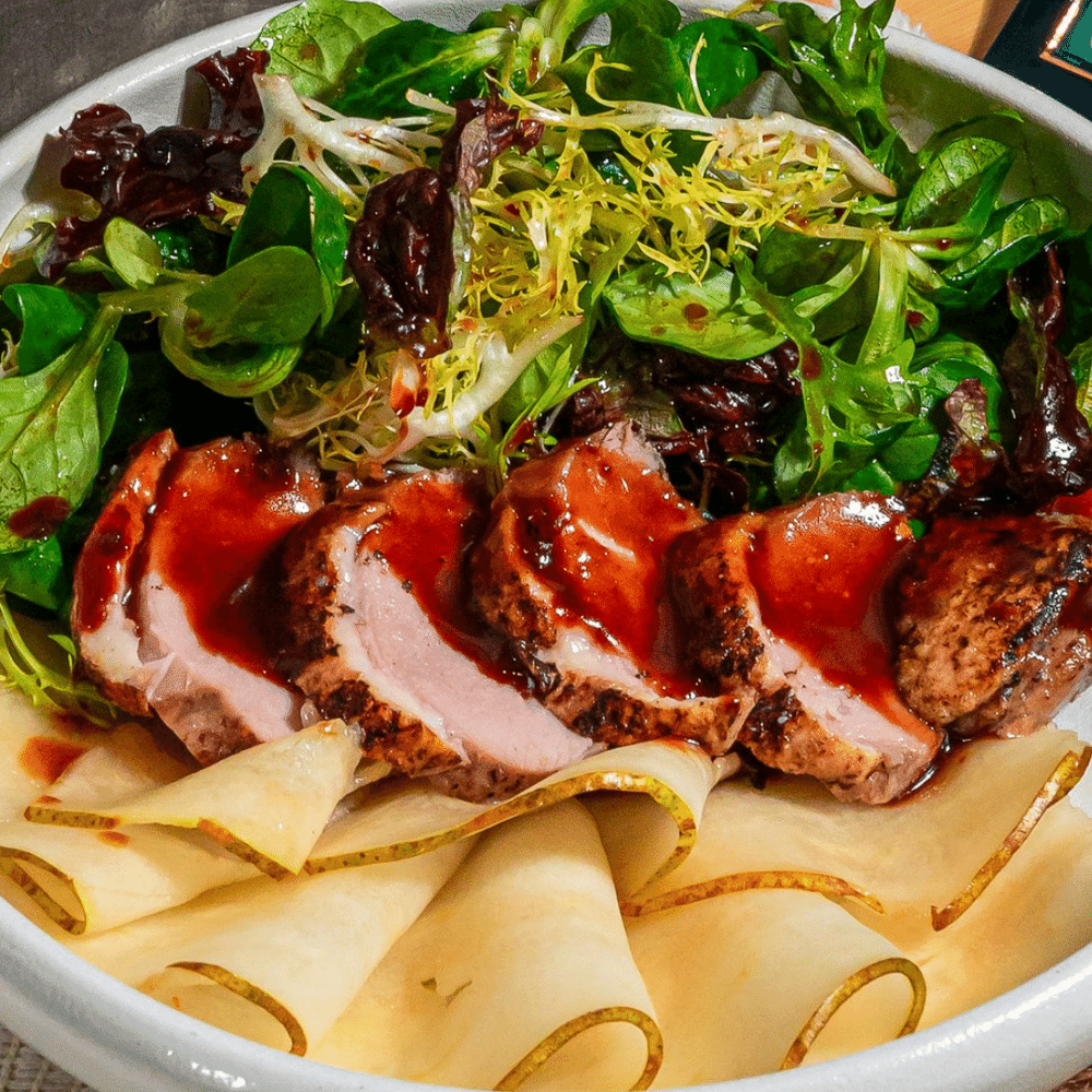 утиное филе в соусе хойсин, груша, микс салат, бальзамический соус