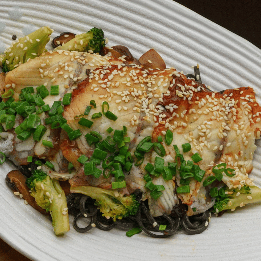 угорь, лапша с чернилами каракатицы, грибы шиитаки, брокколи, унаги соус, рыбный соус, чеснок, кунжут, зеленый лук