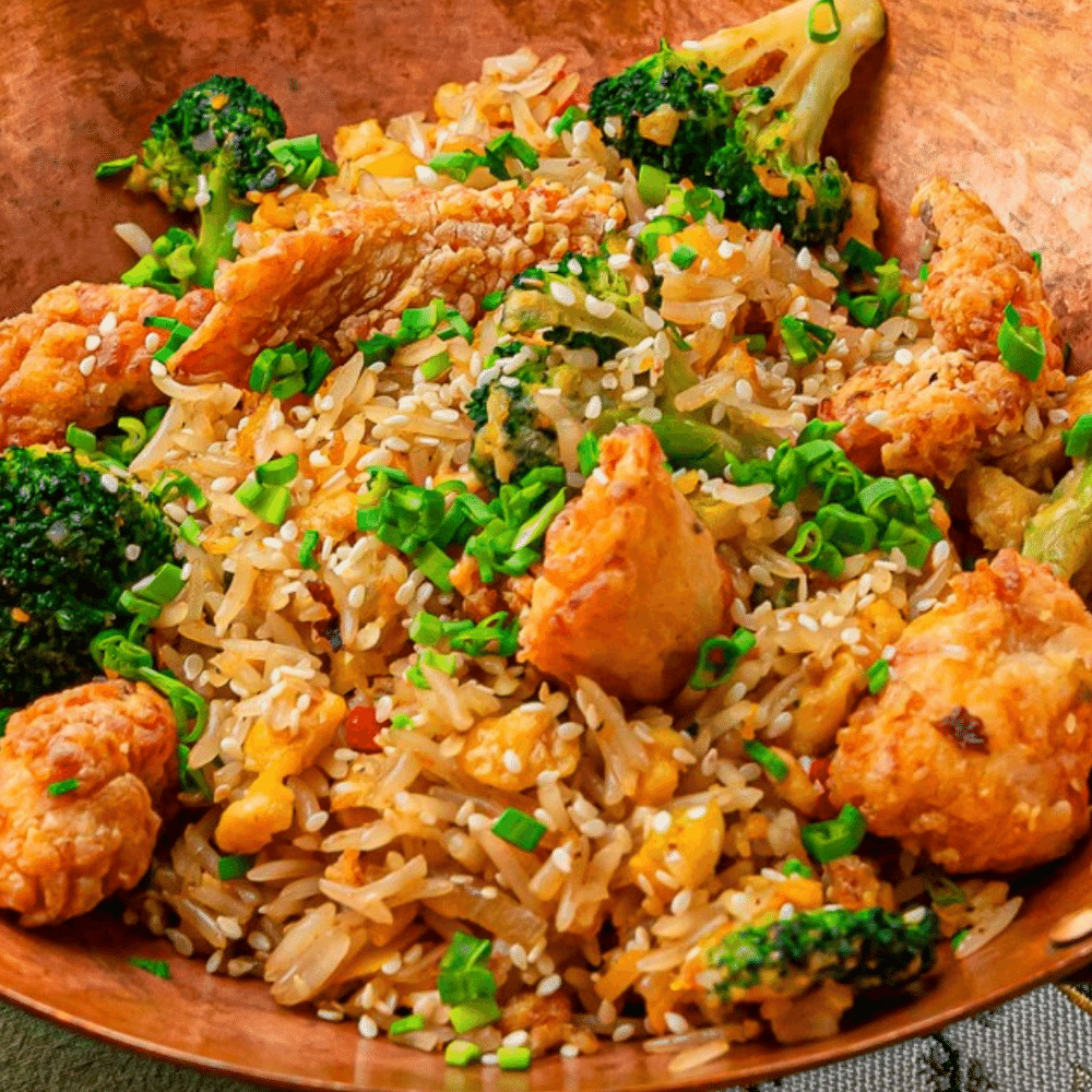 цыпленок карааге, брокколи, перец болгарский, чеснок, лук репчатый, яйцо, рис шинаки, соевый соус, кунжутное масло, зеленый лук, кунжут