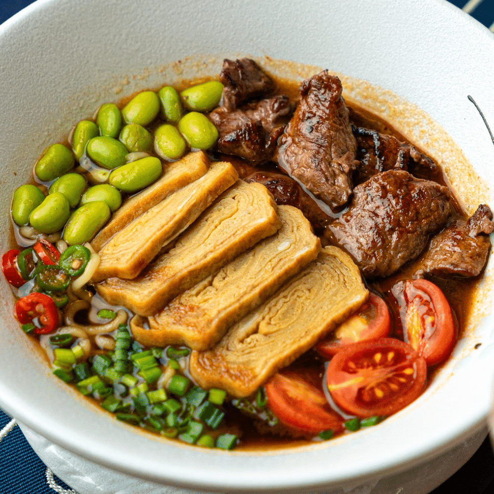 куриный бульон, филе телятины, лук порей, пшеничная лапша, черри, зеленый лук, чили, бобы эдамами, томаго