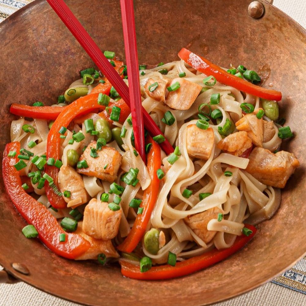 рисовая лапша, лосось, болгарский перец, эдамаме, соус пад-тай
