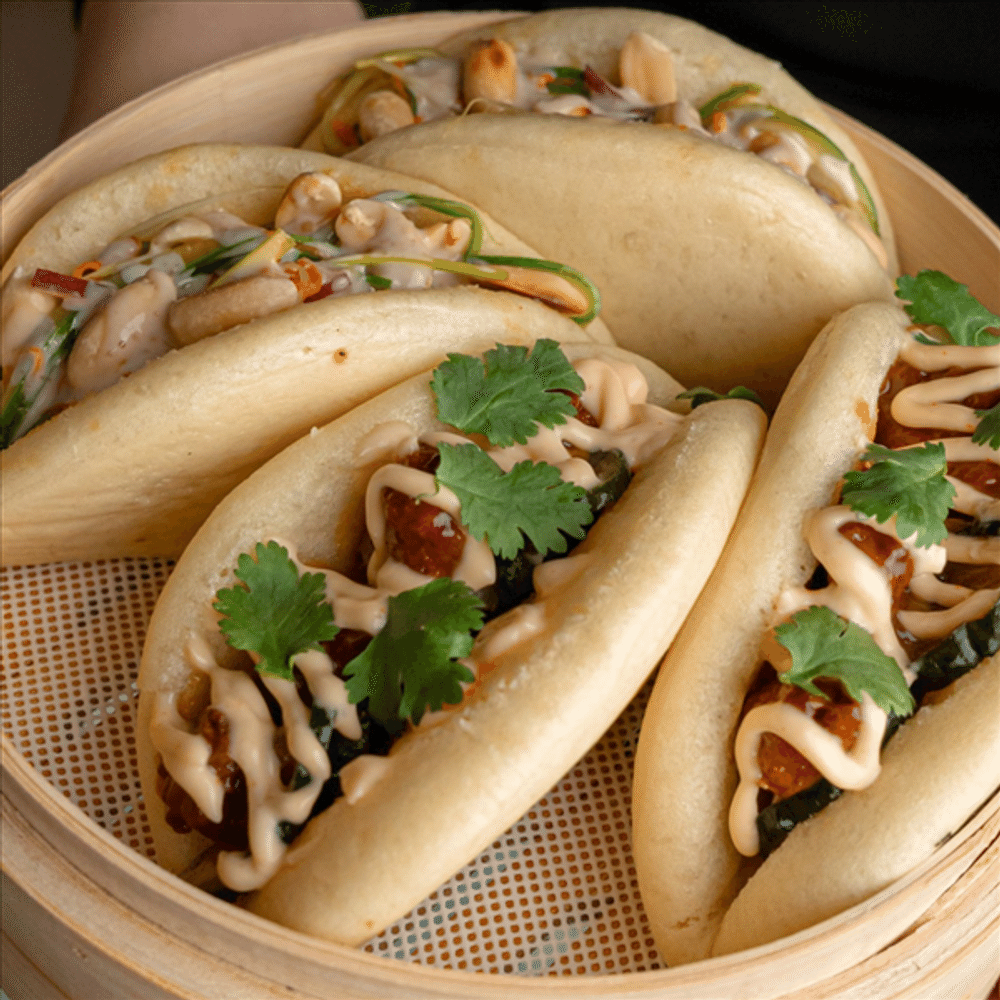 дрожжевая пшеничная булочка на пару, курица карааге, маринованный огурец, соус спайси-майо, кинза
