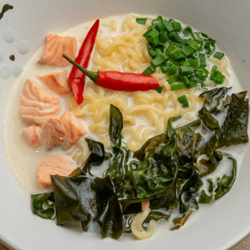 рыбный бульон, сливки, водоросли вакамэ, пшеничная лапша, лосось, перец чили
