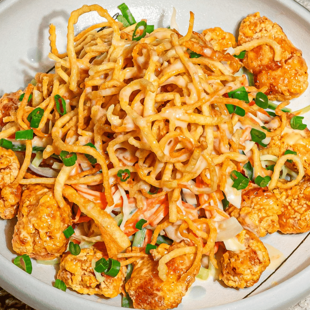 филе цыпленка с соусом спайси майо, капуста, морковь, свежий огурец, красный лук, кунжут, соус ореховый