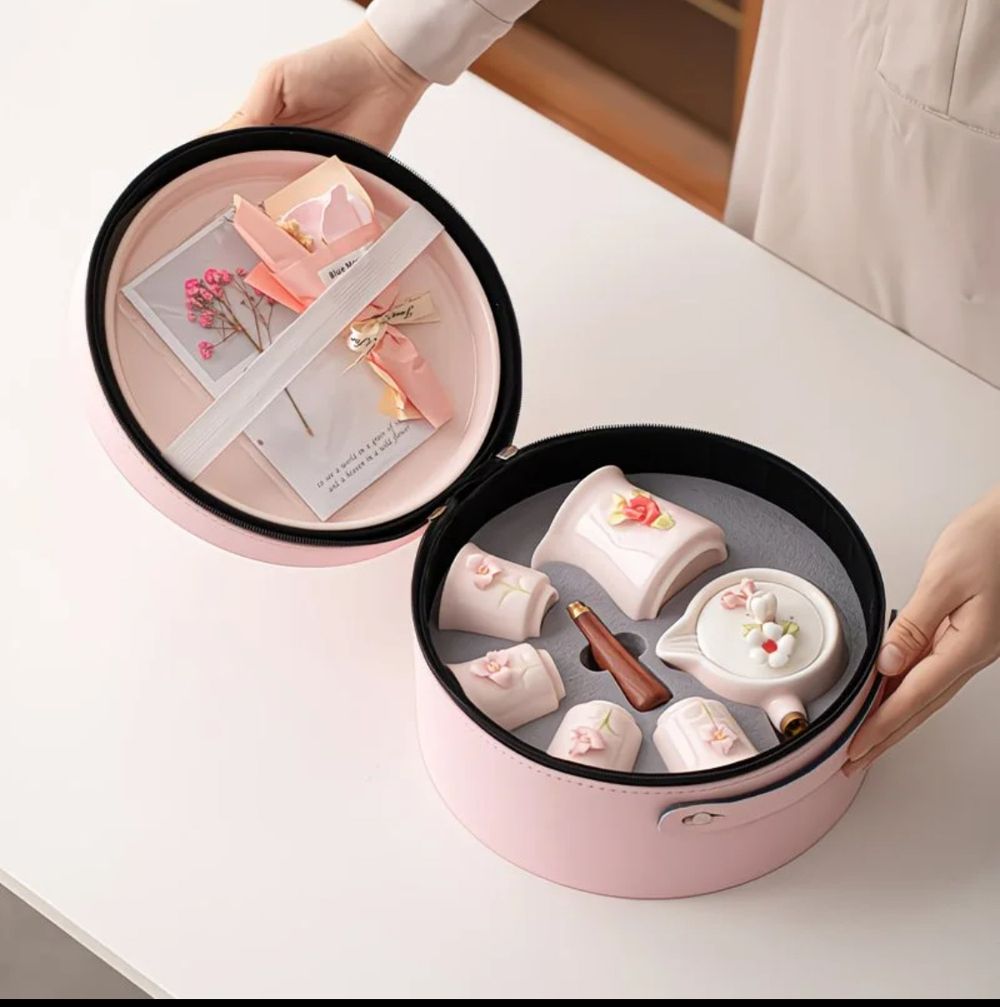 Чайный набор розовый в круглом чемоданчике